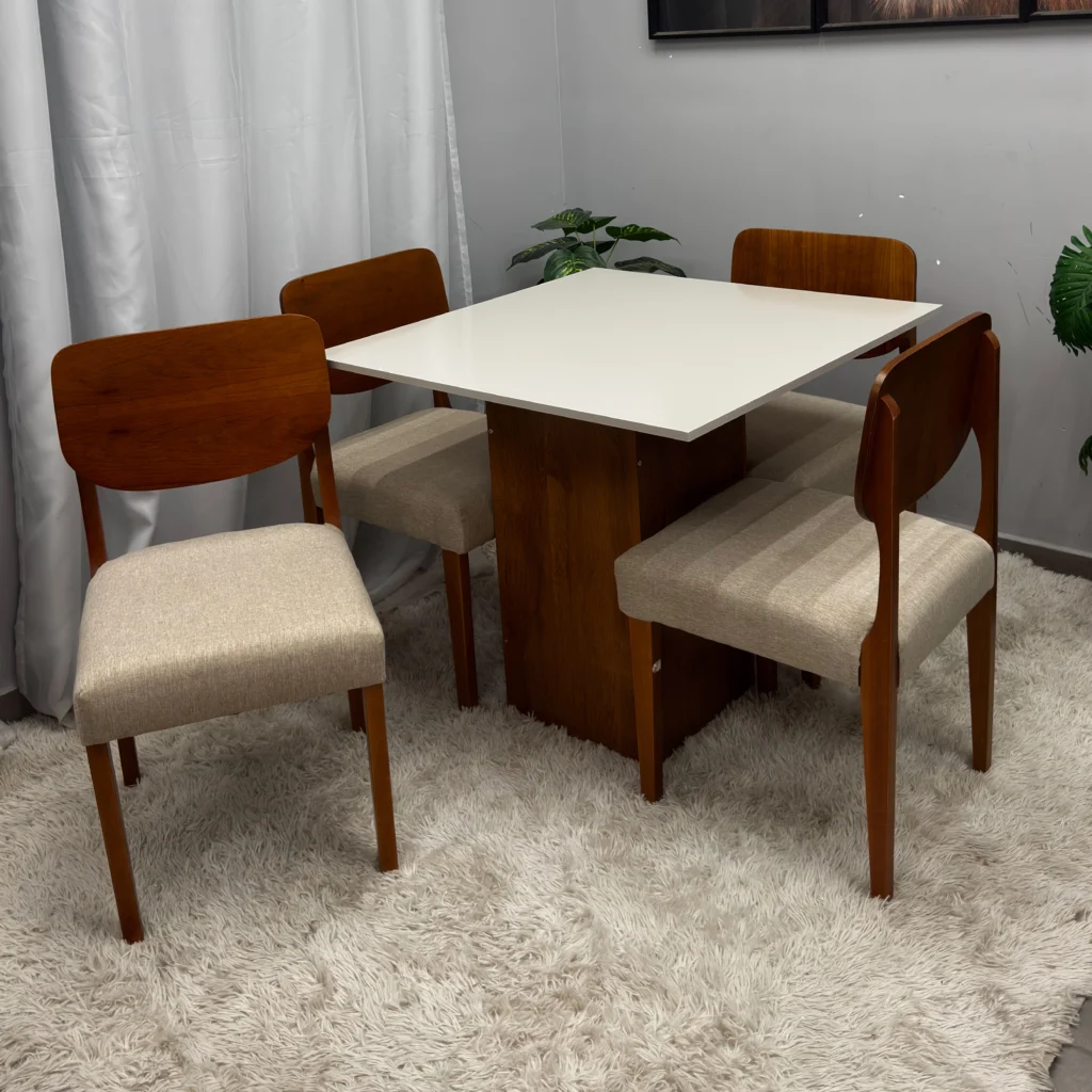 A Mesa de Jantar Dakota 90x90cm SEM Vidro e 4 Cadeiras Barcelona em Linho Madeira Cel Móveis, com seu formato quadrado e tampo amadeirado sem vidro, é a escolha ideal para quem busca otimizar espaços pequenos sem abrir mão da elegância e do aconchego. O conjunto acompanha 4 cadeiras, que se destacam pelo conforto, conferindo um toque suave e um visual sofisticado ao ambiente. O conjunto une durabilidade e um design clean, sendo perfeito para criar uma sala de jantar moderna, prática e convidativa para as refeições do dia a dia.