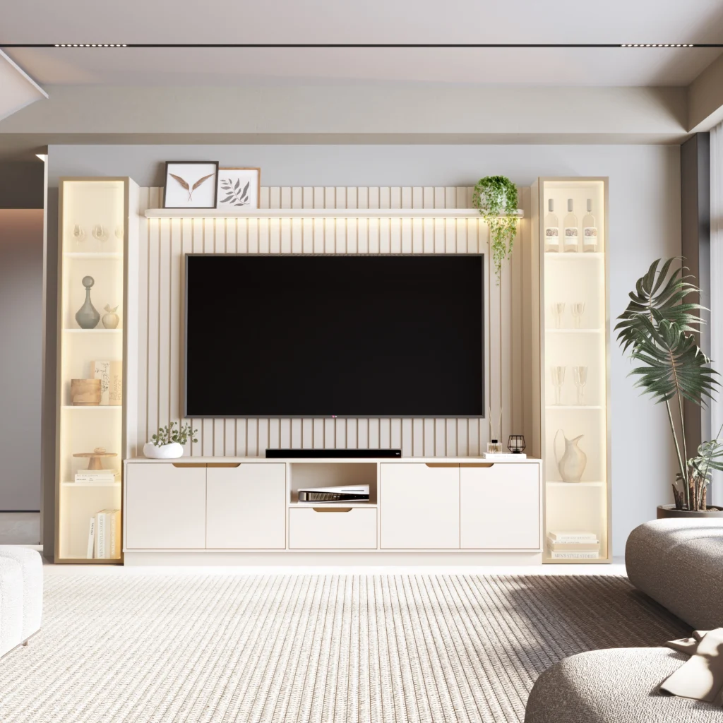 O Rack com Painel Tucuma Ripado 230cm com Prateleira 2 Torres e LED 6 Portas 1 Gaveta JB Bechara é a solução definitiva para quem busca unir sofisticação e funcionalidade na organização da sala de estar. Seu design moderno prioriza a otimização do espaço, oferecendo amplos compartimentos internos e superfícies estratégicas que acomodam desde eletrônicos até itens decorativos com total elegância. Fabricado com materiais de alta resistência e acabamento impecável, este móvel transforma o ambiente em um verdadeiro centro de entretenimento, adaptando-se perfeitamente a diferentes estilos de decoração e proporcionando um visual clean e moderno para o seu lar.