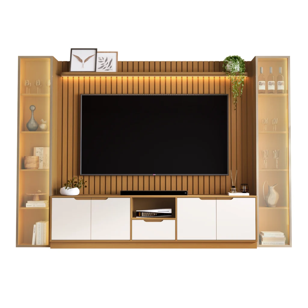 | Modelo | Rack com Painel Tucuma Ripado 230cm com Prateleira 2 Torres e Led |
