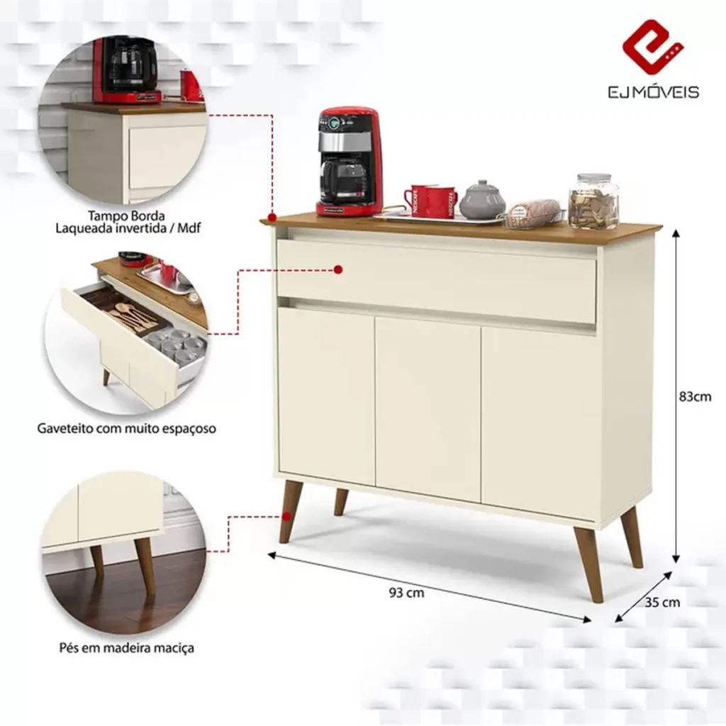 Mais do que apenas um móvel funcional, o Aparador Buffet Zeus 3 Portas 1 Gaveta EJ é uma peça que representa o bom gosto e a praticidade. Com linhas contemporâneas e detalhes elegantes, ele é o toque final que faltava na decoração da sua casa.
