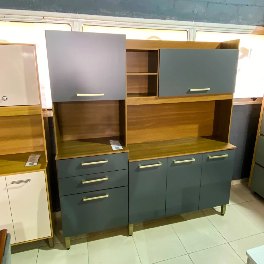 Este armário de cozinha se destaca pela versatilidade e pela capacidade de se adaptar a diferentes tipos de cozinha. As portas e gavetas, além de oferecerem excelente capacidade de armazenamento, possuem um acabamento que confere um toque de modernidade ao ambiente. A qualidade dos materiais utilizados na fabricação pela Demobile garante a durabilidade e a resistência do móvel, acompanhando o ritmo do seu dia a dia na cozinha.