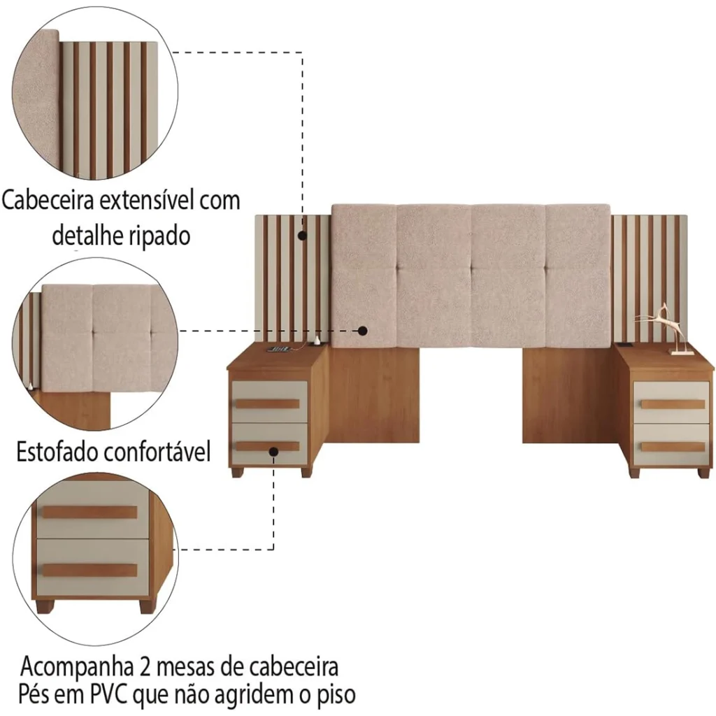 A Cabeceira Suíça Extensível com Tomada e 2 Mesas de Apoio Ripado Estofado RV Móveis é o elemento central ideal para transformar seu dormitório em um ambiente de puro requinte e funcionalidade. Este conjunto une design contemporâneo à praticidade tecnológica, oferecendo a possibilidade de montar nas configurações Casal, Queen ou King. Além disso, possui mesas de apoio integradas para organizar objetos pessoais e um sistema elétrico embutido que facilita o carregamento de dispositivos eletrônicos durante o repouso. O acabamento em relevo linear combinado ao painel macio proporciona conforto térmico e acústico superior, enquanto sua largura ajustável garante um encaixe perfeito em diferentes tamanhos de colchão, elevando o padrão estético e a conveniência do seu espaço de descanso.