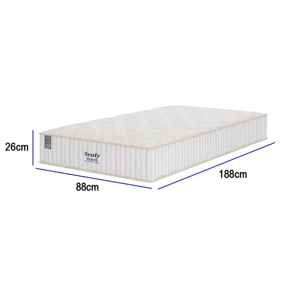 O Colchão Miami Solteiro 26x188x88cm Com Molas Ensacadas Sealy é ideal para um sono reparador, combinando suporte individualizado que não transfere movimento com tecnologias avançadas. Ele possui o reforço Polyframe nas bordas para aumentar a área útil e estabilidade, além de uma Manta Acrílica para proteger as molas e a espuma, garantindo durabilidade. Fabricado com a tecnologia americana, o colchão inclui um EuroPillow para maciez extra, bordado localizado para sofisticação e malha de alta qualidade, e conta com proteção antiacaro, antibacteria e antifungo essencial para climas úmidos. O revestimento inferior antiderrapante e o tecido Suede nas laterais completam o design elegante e funcional deste produto, prometendo conforto e satisfação.