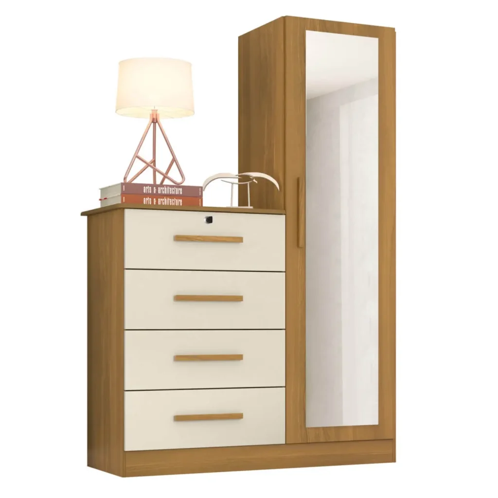 A Cômoda Belize 4 Gavetas 1 Porta com Espelho Albatroz é perfeita para você que procura praticidade e organização para o seu quarto. Preparada para acomodar peças de todos os tamanhos, conta com quatro gavetas e um armario multiuso lateral para manter tudo bem organizado. Possui um excelente espaço, com puxadores em MDF Revestidos e as corrediças telescópicas.