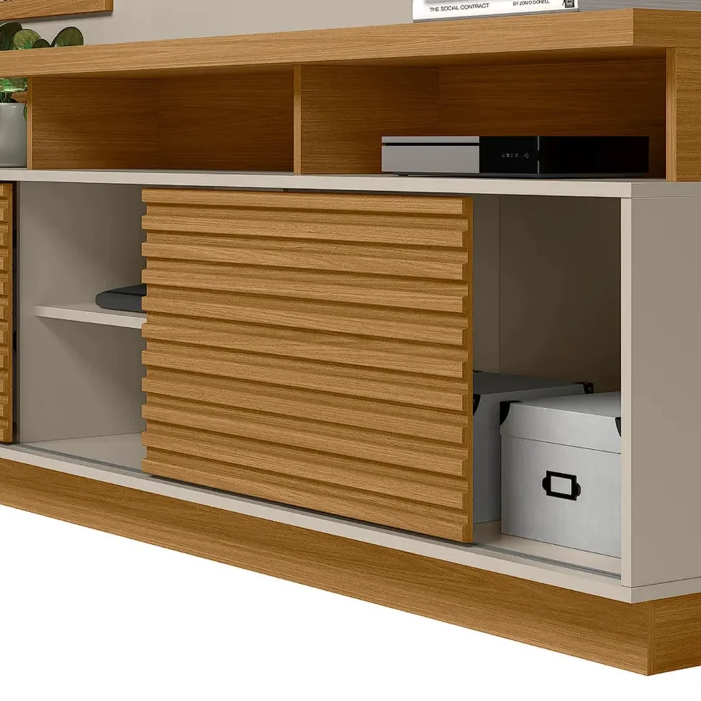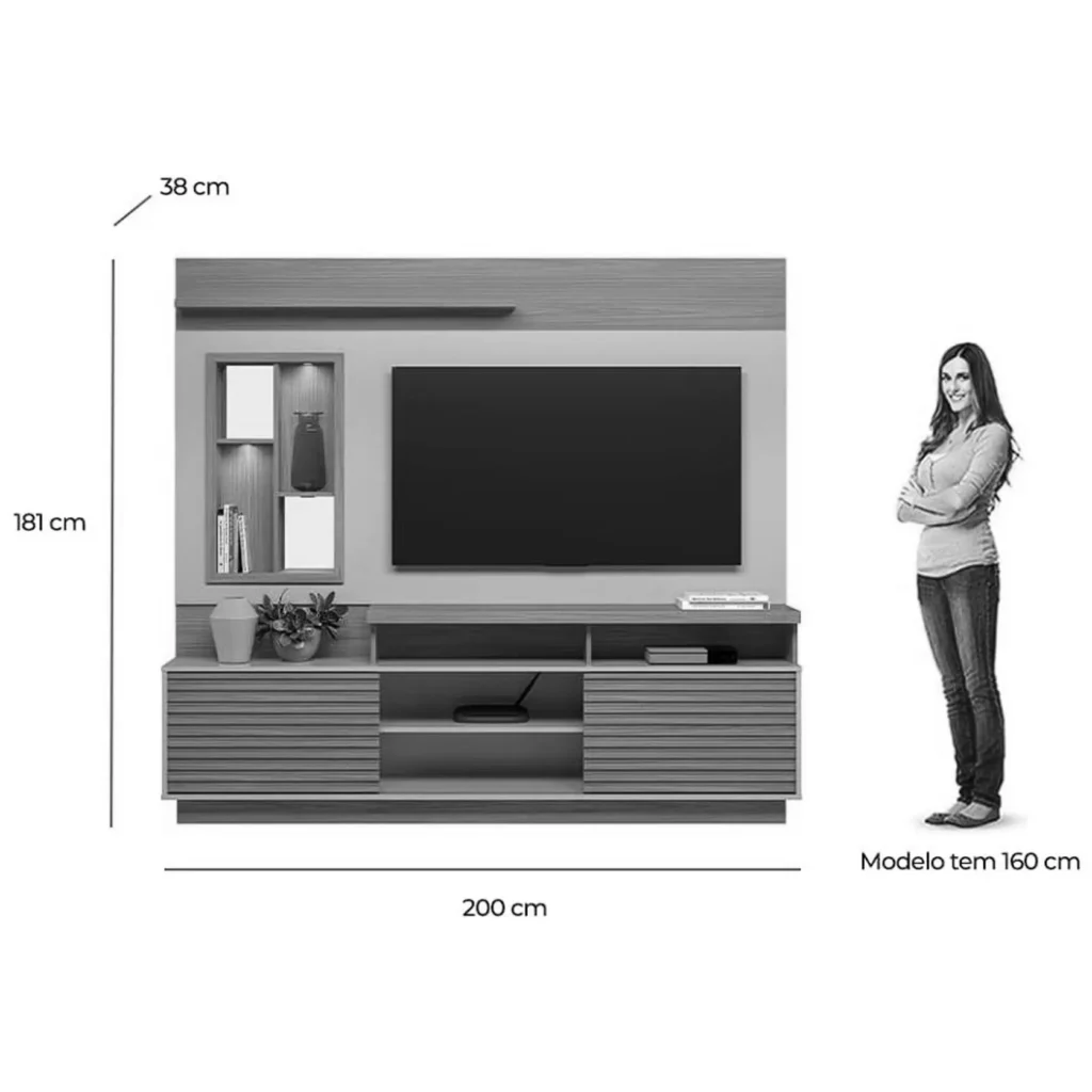 O detalhe ripado e a iluminação LED embutida criam um efeito visual único, valorizando ainda mais a sua TV e proporcionando um toque de modernidade e elegância. As duas portas espaçosas garantem um espaço discreto para guardar eletrônicos, DVDs ou outros objetos, mantendo a organização do ambiente.