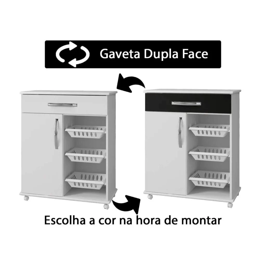 A Fruteira Goiânia Flex Arte Móveis possui tampo e base em MDF de 18 mm. Bordas arredondadas e pintadas corrediça metálica na gaveta, também possui 3 (três) cestos removíveis, 1 (uma) porta e 1 (uma) gaveta. Podendo ser utilizado como suporte de microondas. Além disso tem um excelente custo benefício.
