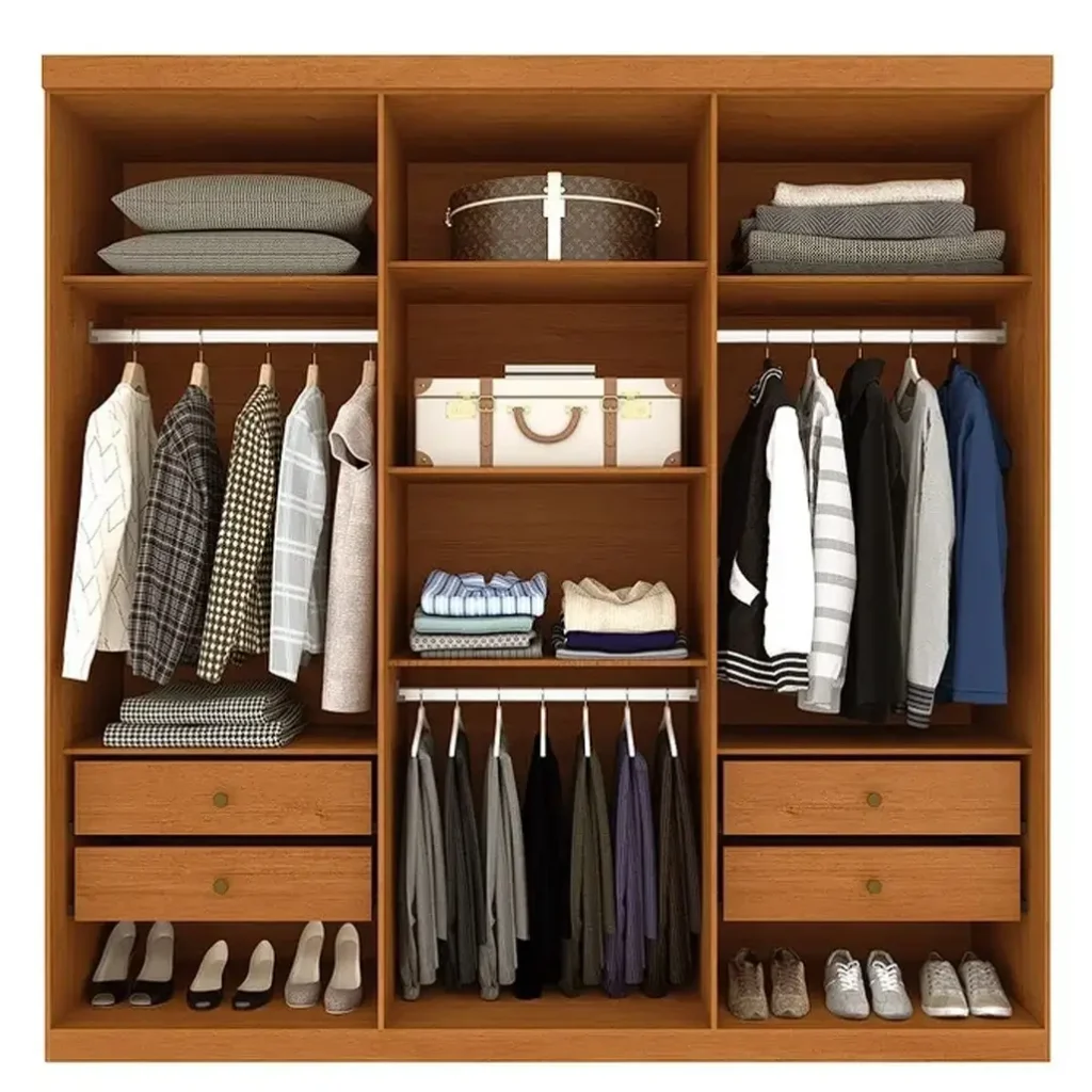 Com seis portas e quatro gavetas, o modelo proporciona excelente capacidade de armazenamento, acomodando roupas, calçados, acessórios e itens do dia a dia de forma prática. Internamente, o espaço é bem distribuído, com prateleiras, cabideiros e divisórias que facilitam a organização e otimizam o uso interno, atendendo perfeitamente às necessidades de um casal.