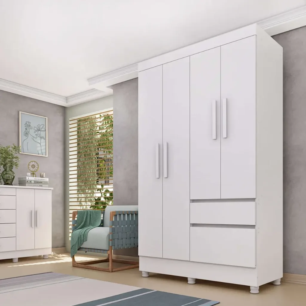 Mas não é só isso! O Guarda Roupa Oregon Solteiro 4 Portas 2 Gavetas Tcil também é uma opção econômica, perfeita para quem procura por móveis acessíveis que não comprometam a qualidade. Afinal, na Estrela Móveis, nosso compromisso é tornar a sua casa um lugar mais bonito e confortável, sem pesar no seu bolso.