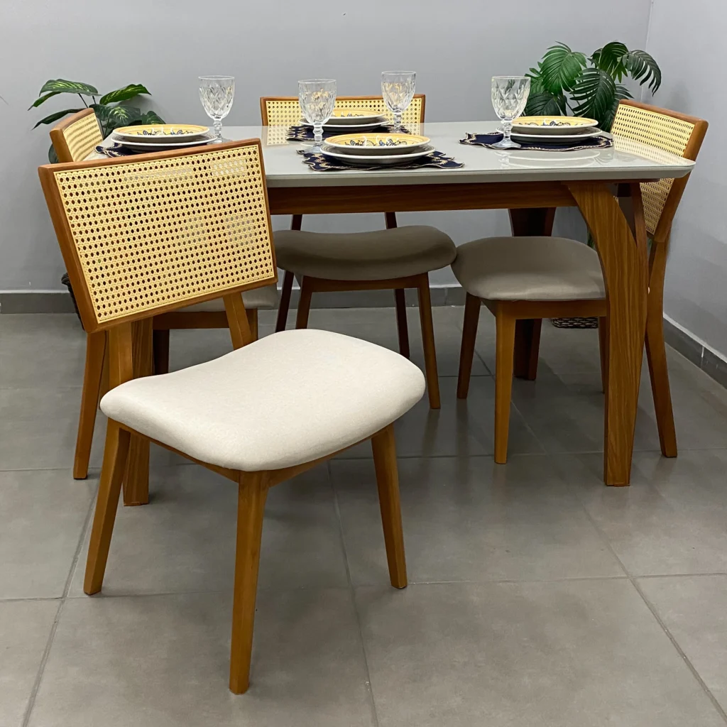 | Estrutura Cadeira | Madeira Maciça, Espuma de Alta Densidade, Tela Sintética |