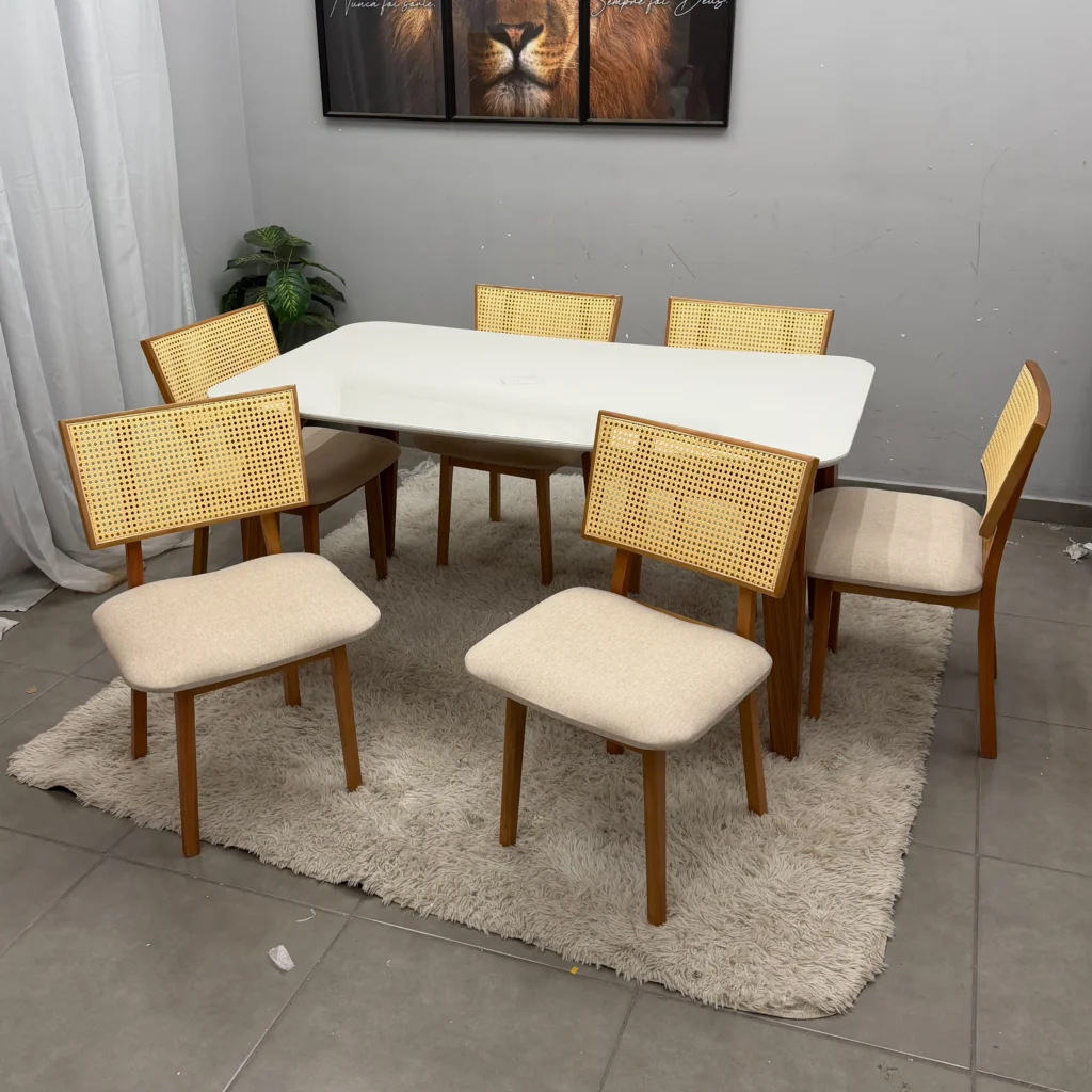 | Modelo | Mesa de Jantar Agata 180x90cm com Vidro e 6 Cadeiras Livia em Linho |