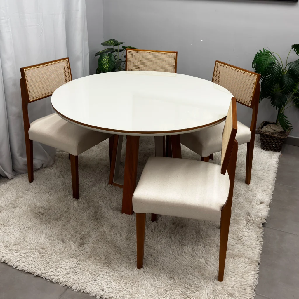 | Modelo | Mesa de Jantar Atlanta 100cm Redonda com Vidro e 4 Cadeiras Grecia em Linho |
