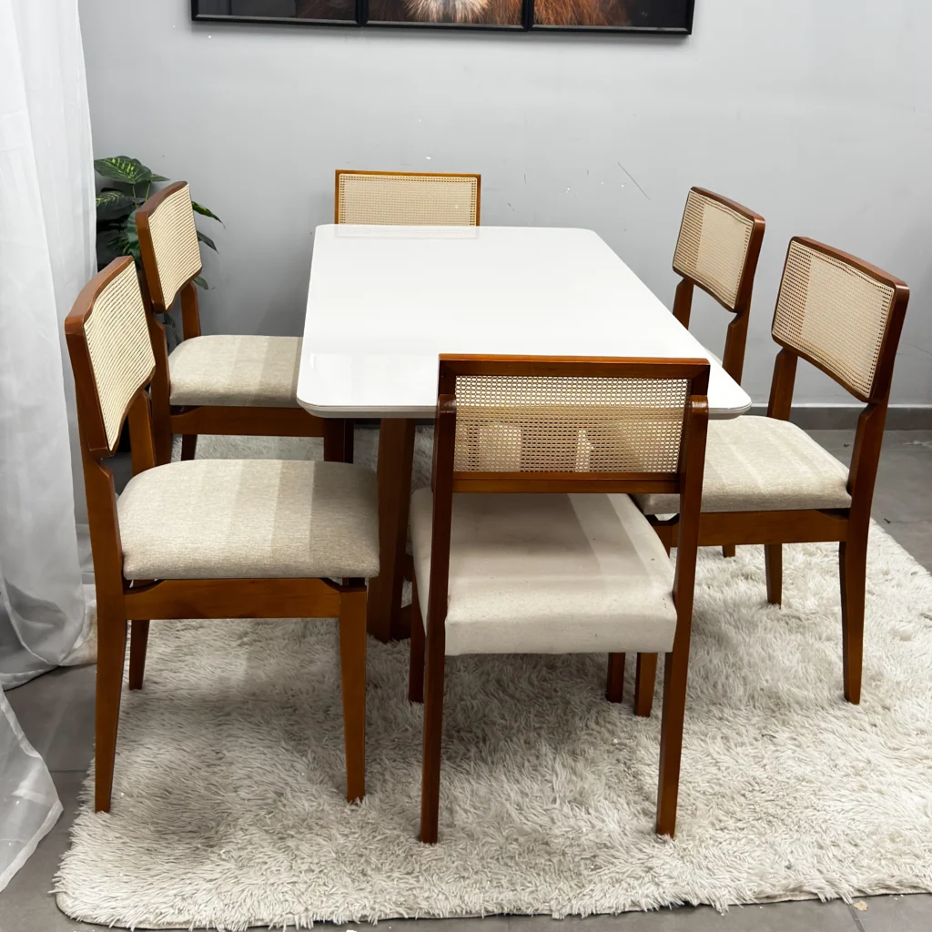 | Modelo | Mesa de Jantar Bali 160x90cm com Vidro e 6 Cadeiras Canada em Linho |