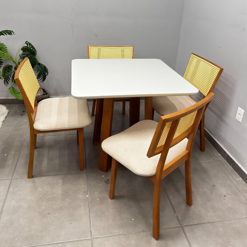 | Modelo | Mesa de Jantar Bali 90x90cm com Vidro e 4 Cadeiras Diamante em Linho |