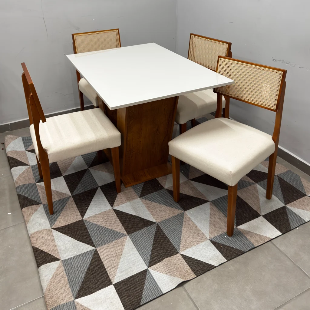 O conjunto acompanha 4 cadeiras, projetadas para proporcionar uma experiência de máximo conforto. Combinando robustez e sofisticação, este conjunto apresenta um acabamento refinado que harmoniza com diversos estilos de decoração, do clássico ao contemporâneo. É a peça central que faltava para renovar seu ambiente com qualidade superior e um visual impecável que impressiona as visitas.
