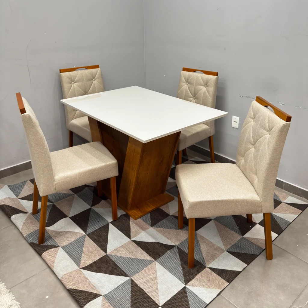 O conjunto acompanha 4 cadeiras, projetadas para proporcionar uma experiência de máximo conforto. Combinando robustez e sofisticação, este conjunto apresenta um acabamento refinado que harmoniza com diversos estilos de decoração, do clássico ao contemporâneo. É a peça central que faltava para renovar seu ambiente com qualidade superior e um visual impecável que impressiona as visitas.