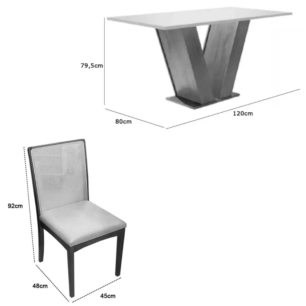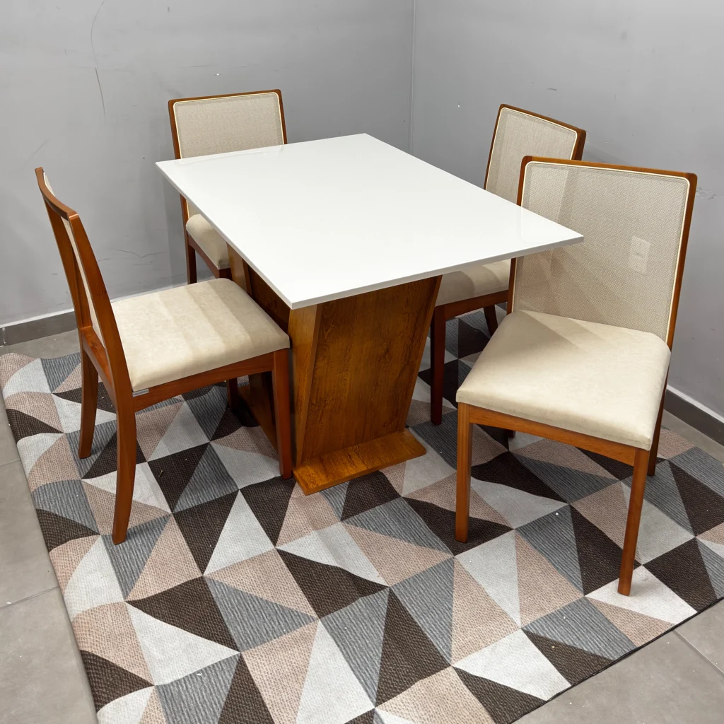O conjunto acompanha 4 cadeiras, projetadas para proporcionar uma experiência de máximo conforto. Combinando robustez e sofisticação, este conjunto apresenta um acabamento refinado que harmoniza com diversos estilos de decoração, do clássico ao contemporâneo. É a peça central que faltava para renovar seu ambiente com qualidade superior e um visual impecável que impressiona as visitas.