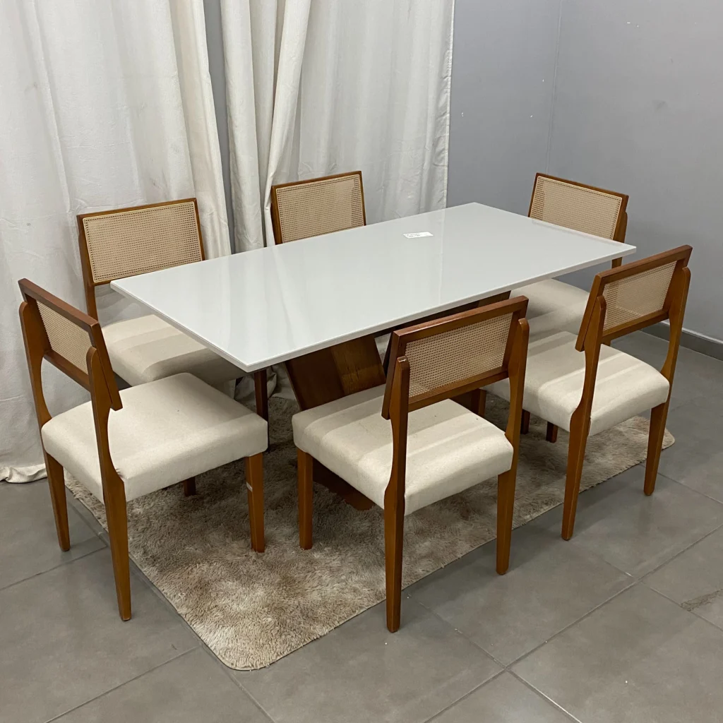 O conjunto acompanha 6 cadeiras, projetadas para proporcionar uma experiência de máximo conforto. Combinando robustez e sofisticação, este conjunto apresenta um acabamento refinado que harmoniza com diversos estilos de decoração, do clássico ao contemporâneo. É a peça central que faltava para renovar seu ambiente com qualidade superior e um visual impecável que impressiona as visitas.