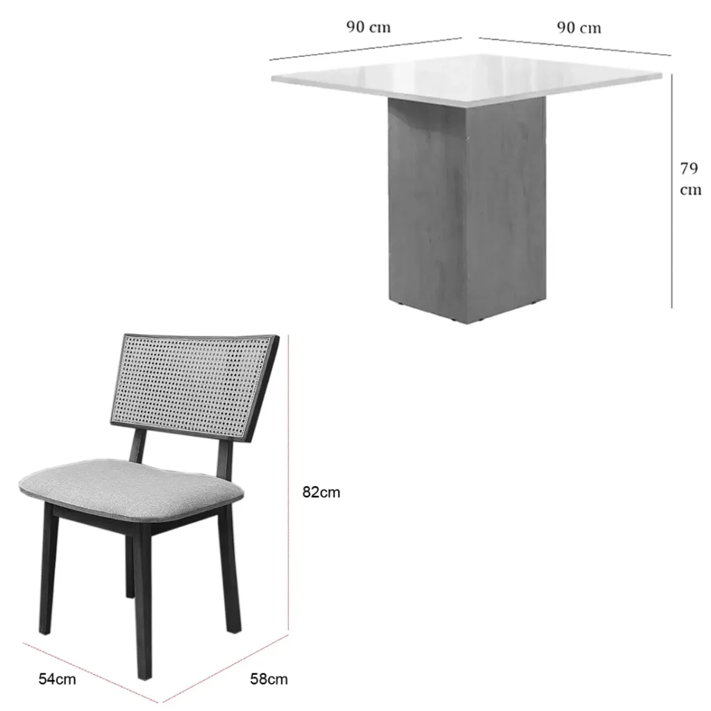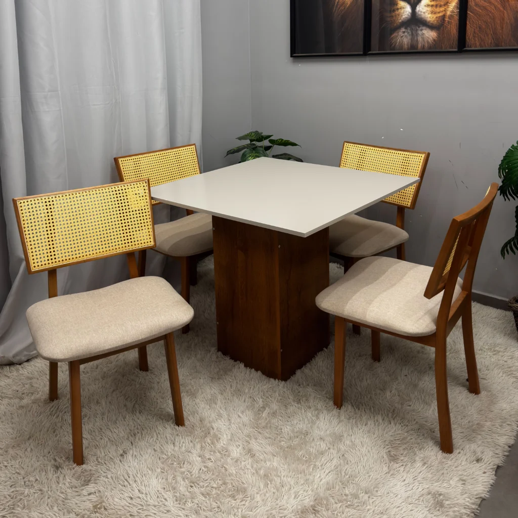 A Mesa de Jantar Dakota 90x90cm SEM Vidro e 4 Cadeiras Diamante em Linho Madeira Cel Móveis, com seu formato quadrado e tampo amadeirado sem vidro, é a escolha ideal para quem busca otimizar espaços pequenos sem abrir mão da elegância e do aconchego. O conjunto acompanha 4 cadeiras, que se destacam pelo conforto, conferindo um toque suave e um visual sofisticado ao ambiente. O conjunto une durabilidade e um design clean, sendo perfeito para criar uma sala de jantar moderna, prática e convidativa para as refeições do dia a dia.