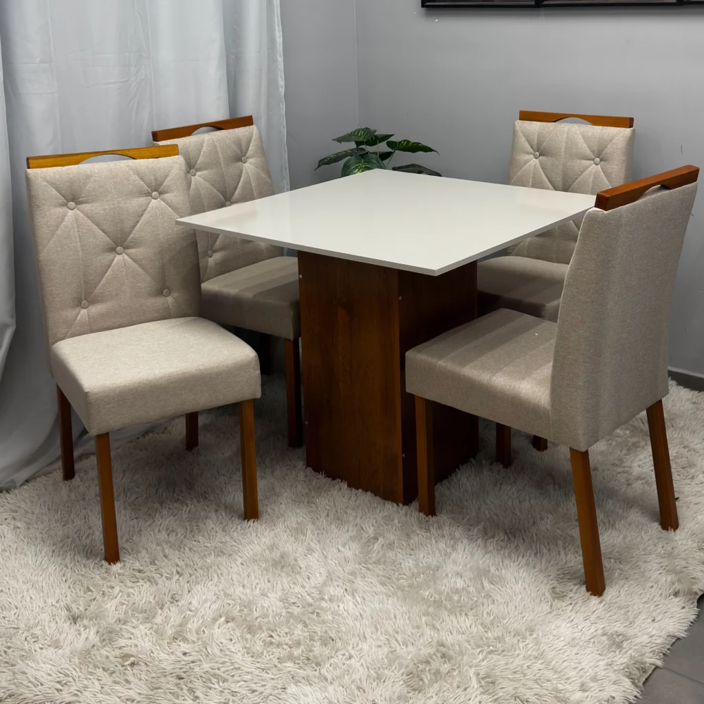 A Mesa de Jantar Dakota 90x90cm SEM Vidro e 4 Cadeiras Jasmim em Linho Estofadas Cel Móveis, com seu formato quadrado e tampo amadeirado sem vidro, é a escolha ideal para quem busca otimizar espaços pequenos sem abrir mão da elegância e do aconchego. O conjunto acompanha 4 cadeiras, que se destacam pelo conforto, conferindo um toque suave e um visual sofisticado ao ambiente. O conjunto une durabilidade e um design clean, sendo perfeito para criar uma sala de jantar moderna, prática e convidativa para as refeições do dia a dia.