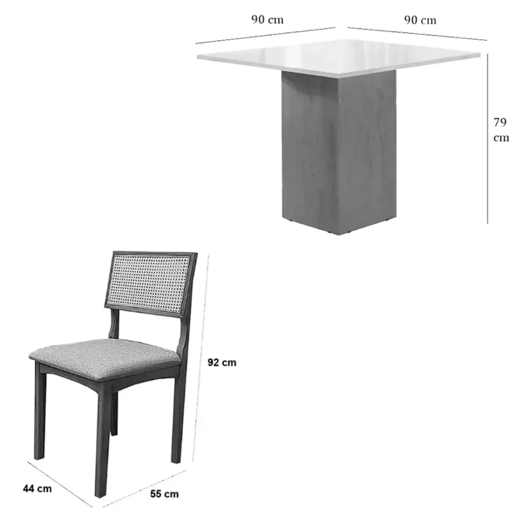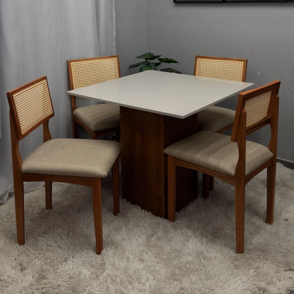 A Mesa de Jantar Dakota 90x90cm SEM Vidro e 4 Cadeiras Monalisa em Linho Madeira Cel Móveis, com seu formato quadrado e tampo amadeirado sem vidro, é a escolha ideal para quem busca otimizar espaços pequenos sem abrir mão da elegância e do aconchego. O conjunto acompanha 4 cadeiras, que se destacam pelo conforto, conferindo um toque suave e um visual sofisticado ao ambiente. O conjunto une durabilidade e um design clean, sendo perfeito para criar uma sala de jantar moderna, prática e convidativa para as refeições do dia a dia.