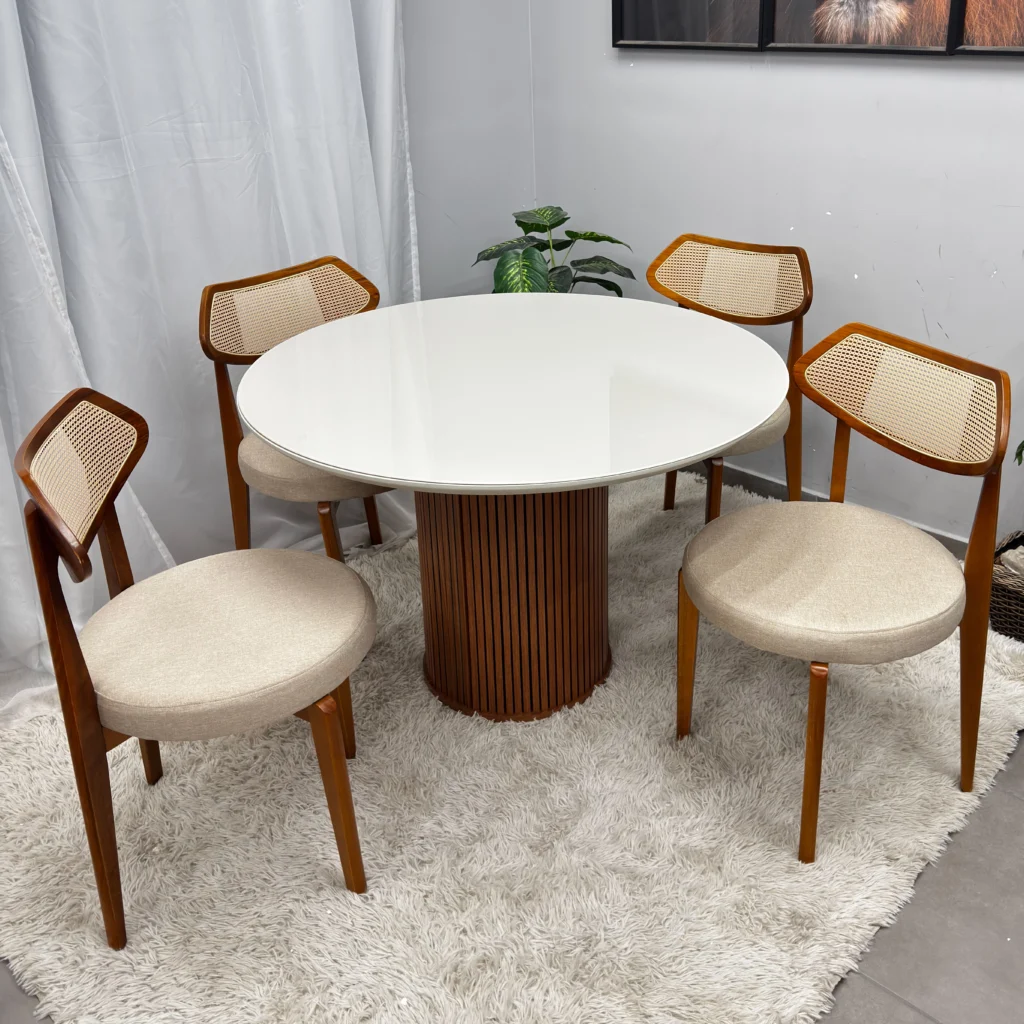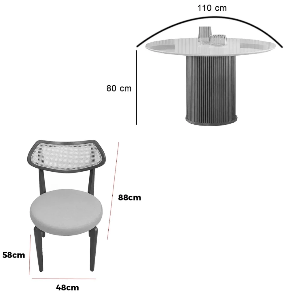 | Modelo | Mesa de Jantar Dara 110cm Redonda com Vidro e 4 Cadeiras Athenas em Linho |