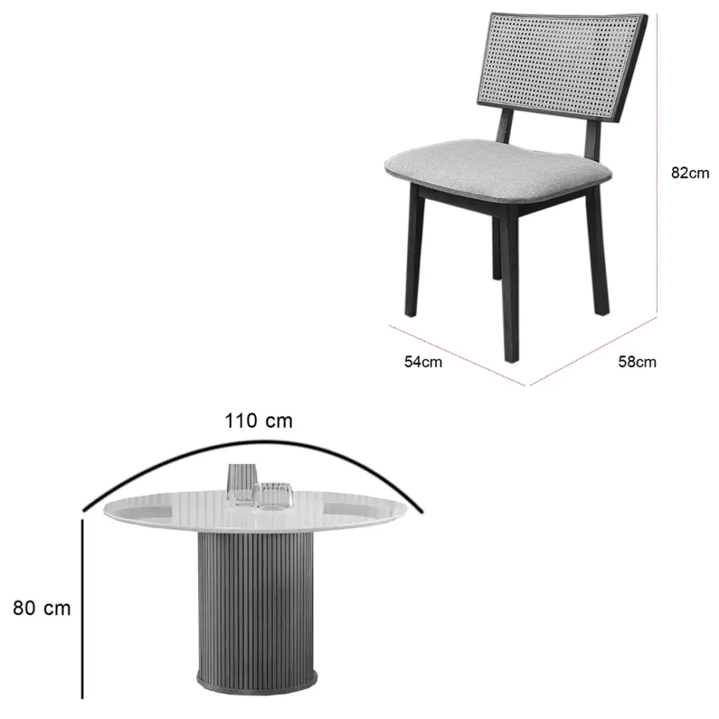 | Modelo | Mesa de Jantar Dara 110cm Redonda com Vidro e 4 Cadeiras Diamante em Linho |