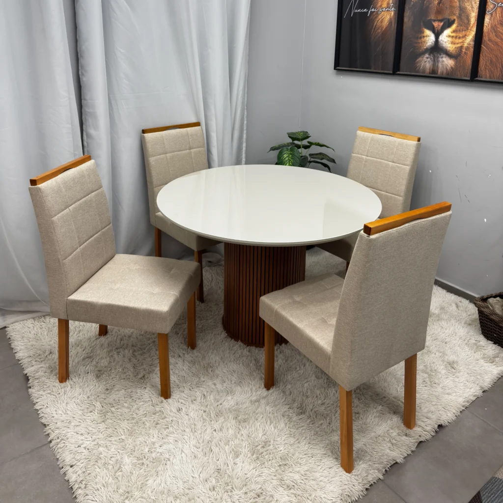 | Modelo | Mesa de Jantar Dara 110cm Redonda com Vidro e 4 Cadeiras Giulia em Linho |