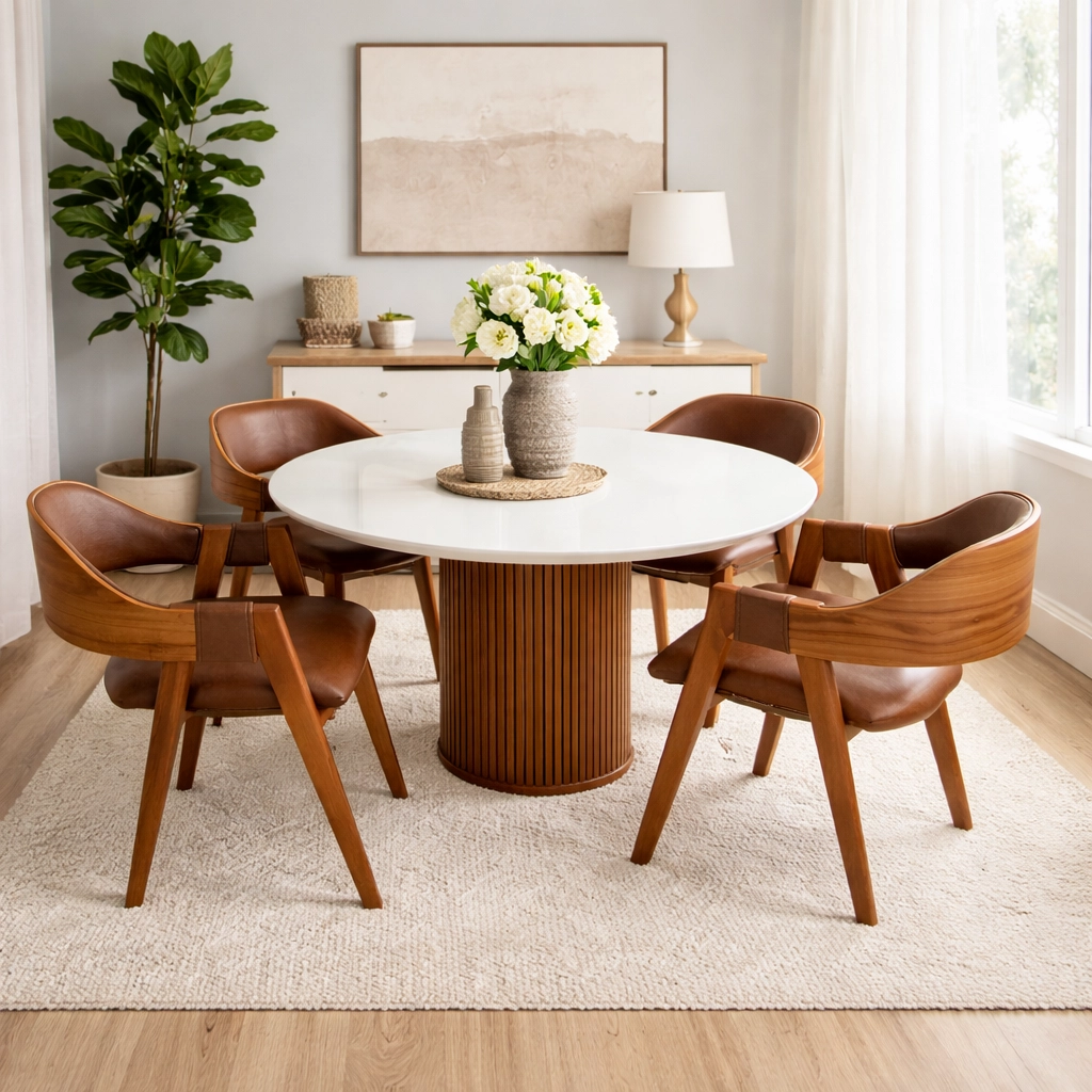 | Modelo | Mesa de Jantar Dara 110cm Redonda com Vidro e 4 Cadeiras Perola em Corino |