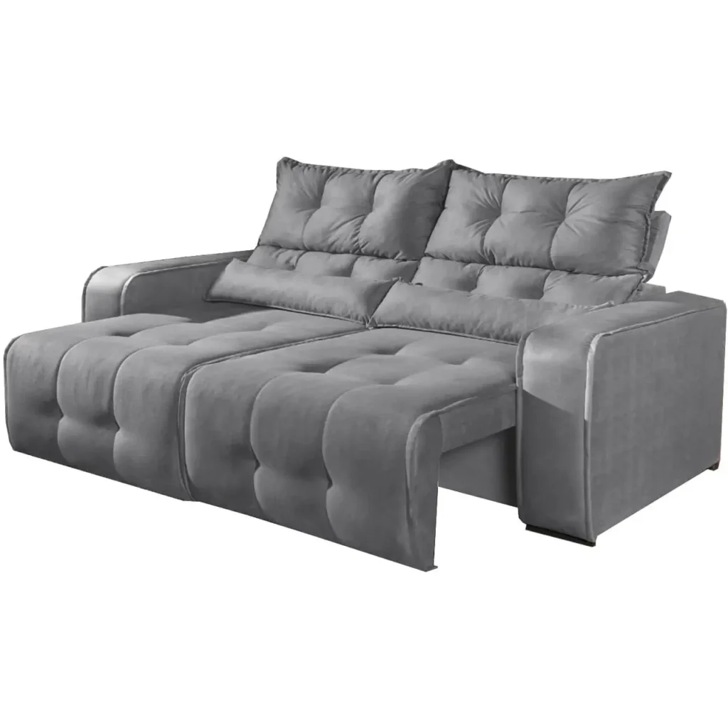 Confeccionado com materiais de alta qualidade, apresenta estrutura em madeira de reflorestamento, revestimento em tecido suede de toque muito macio, assento retrátil em espuma D-28, encosto reclinável em fibra de poliéster siliconizada e braços fixos em espuma.