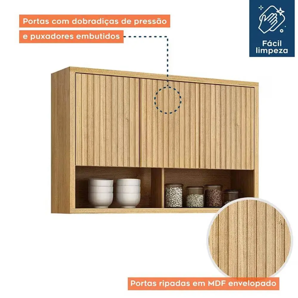 O Armário Aéreo Torino Ripado 3 Portas Valdemóveis oferece uma solução espaçosa e elegante para a organização da sua cozinha.