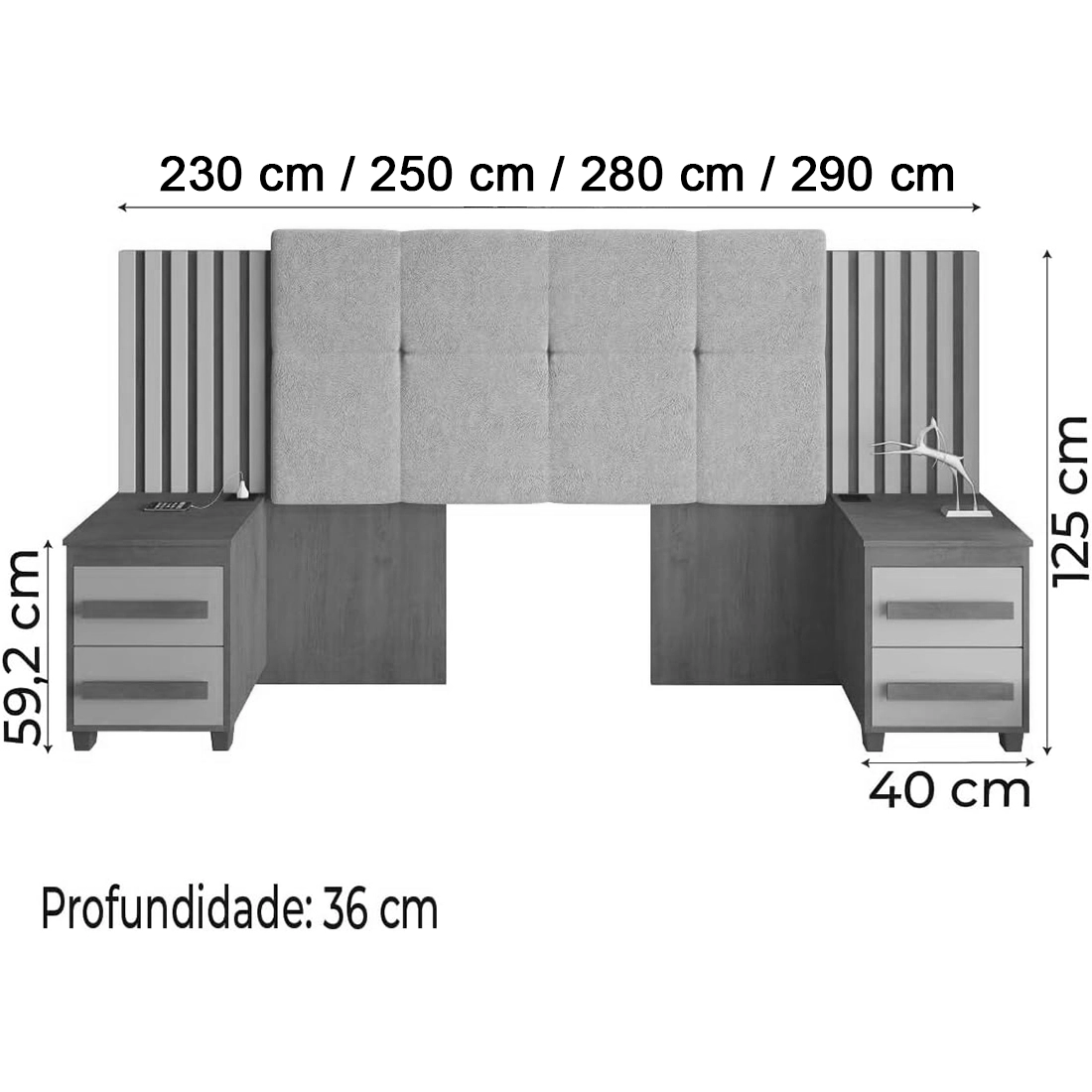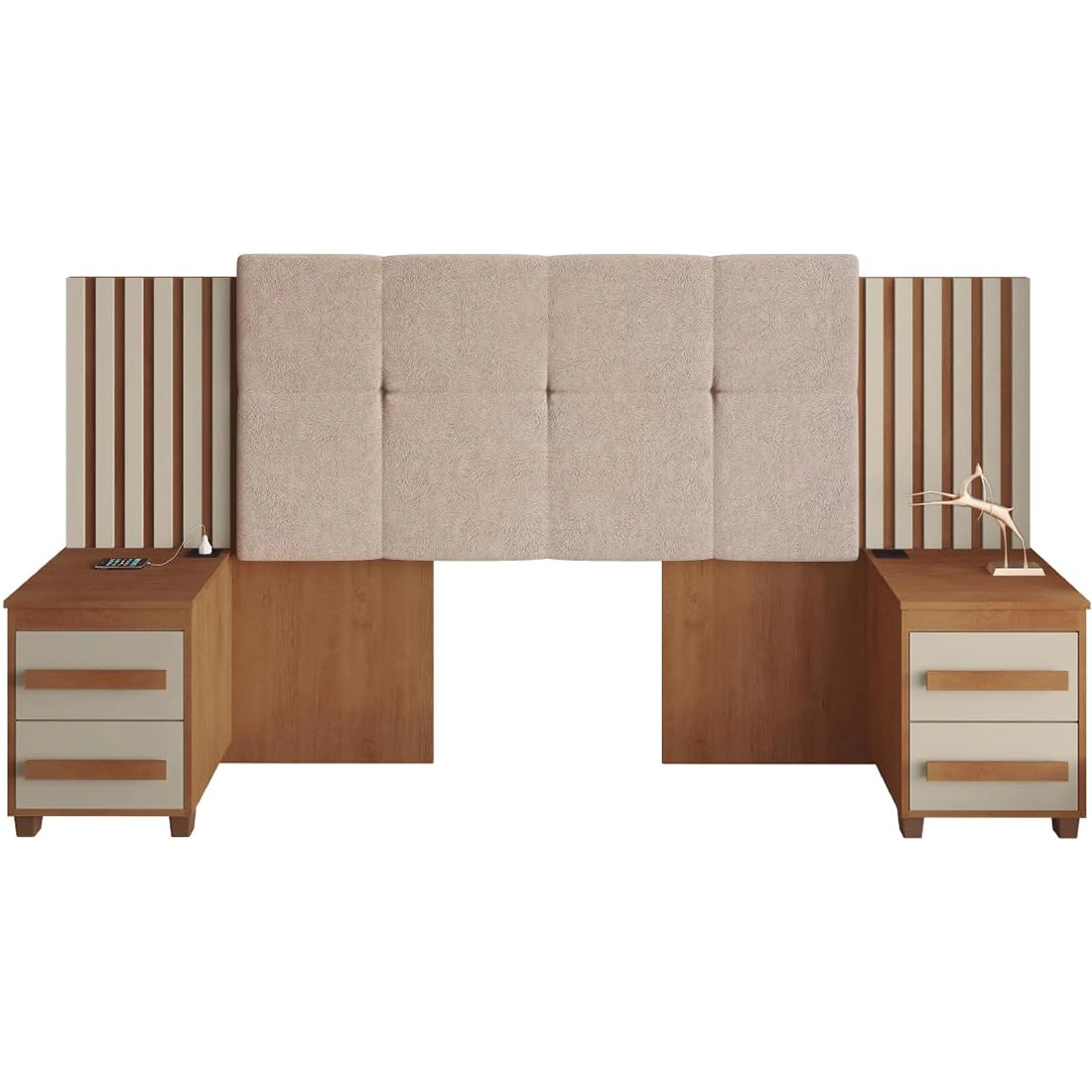 Cabeceira Suíça Extensível com Tomada e 2 Mesas de Apoio Ripado Estofado RV Móveis