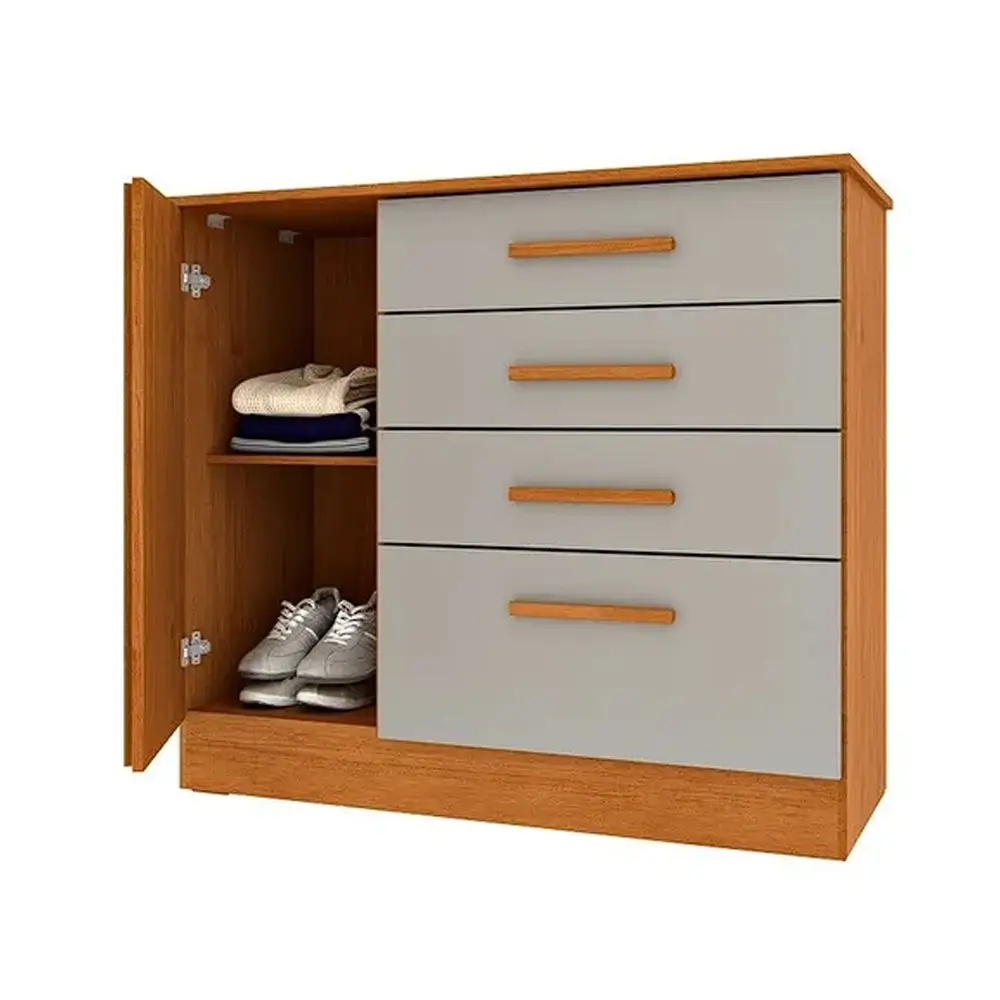 A cômoda conta com quatro gavetas espaçosas com corrediças telescópicas, garantindo um deslizar suave e seguro. Além disso, a porta com prateleira interna oferece um espaço extra para guardar itens maiores, como cobertores, edredons ou caixas organizadoras.