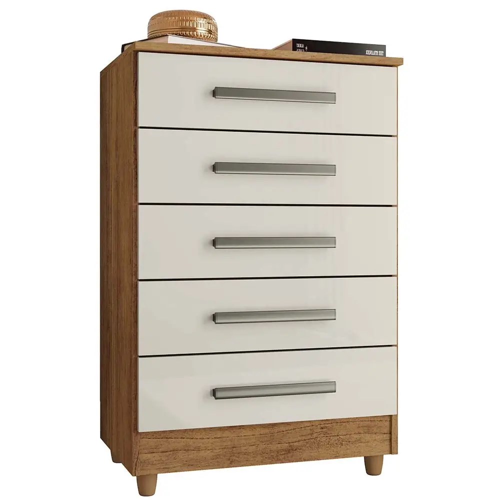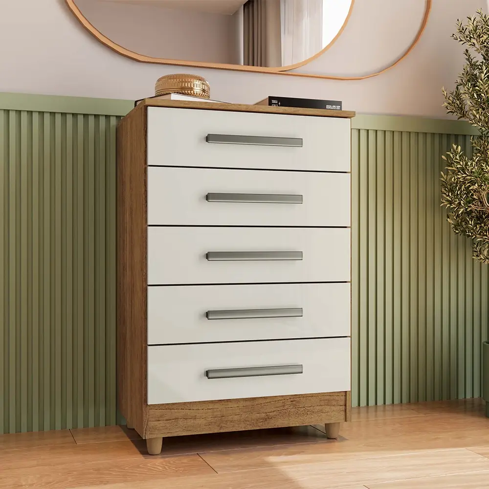 O modelo conta com cinco gavetas espaçosas, ideais para acomodar desde peças do dia a dia até itens menores, como acessórios e documentos. As corrediças proporcionam um deslizamento suave e seguro, facilitando o uso constante. O tampo superior também pode ser utilizado para apoiar itens decorativos, como porta-retratos, luminárias ou perfumes.