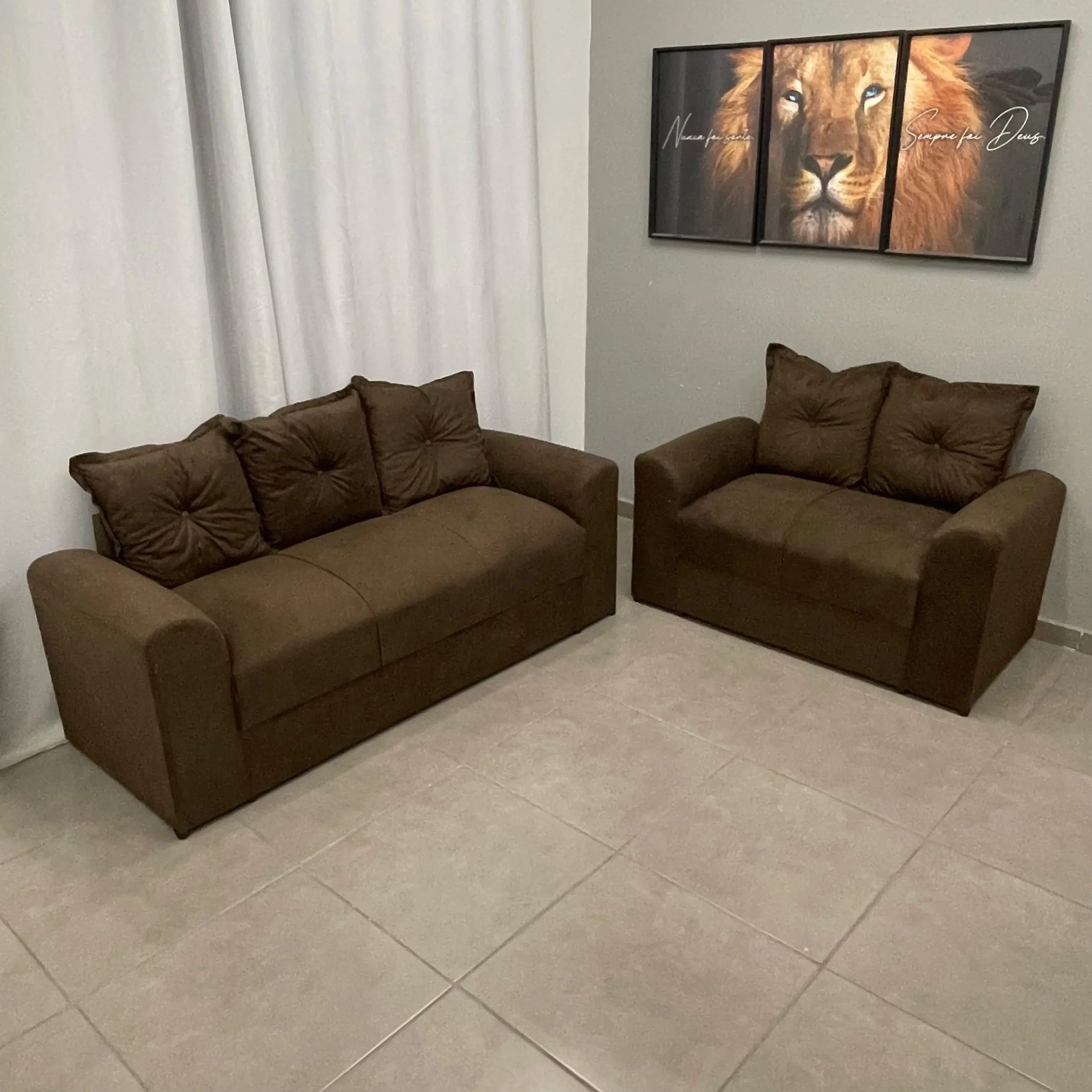 Composto por um sofá de 2 lugares e outro de 3 lugares, o conjunto oferece amplo espaço para reunir família e amigos com muito mais conforto. As almofadas soltas e bem estruturadas proporcionam o apoio ideal para longas conversas, momentos de lazer ou simplesmente relaxar após um dia cansativo. Além disso, a estrutura reforçada garante resistência e durabilidade, sendo um investimento de longa vida útil para seu lar.