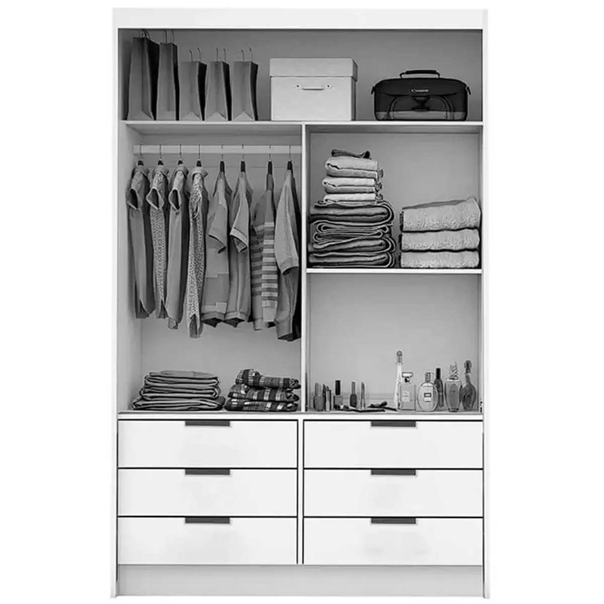 Se a sua vida for cheia de coisas, o Guarda Roupa Sevilha Solteiro Sem Espelho 2 Portas 6 Gavetas Carioca te entende. Com seis gavetas, ele oferece o espaço ideal para você separar seus itens de forma organizada. Roupas, acessórios, coleções de cartas de amor (quem nunca?), tudo o que você quiser.