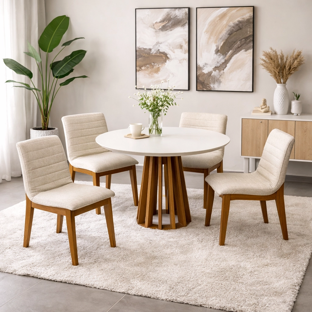 | Modelo | Mesa de Jantar Berlim 100cm Redonda com Vidro e 4 Cadeiras Sofia em Linho |