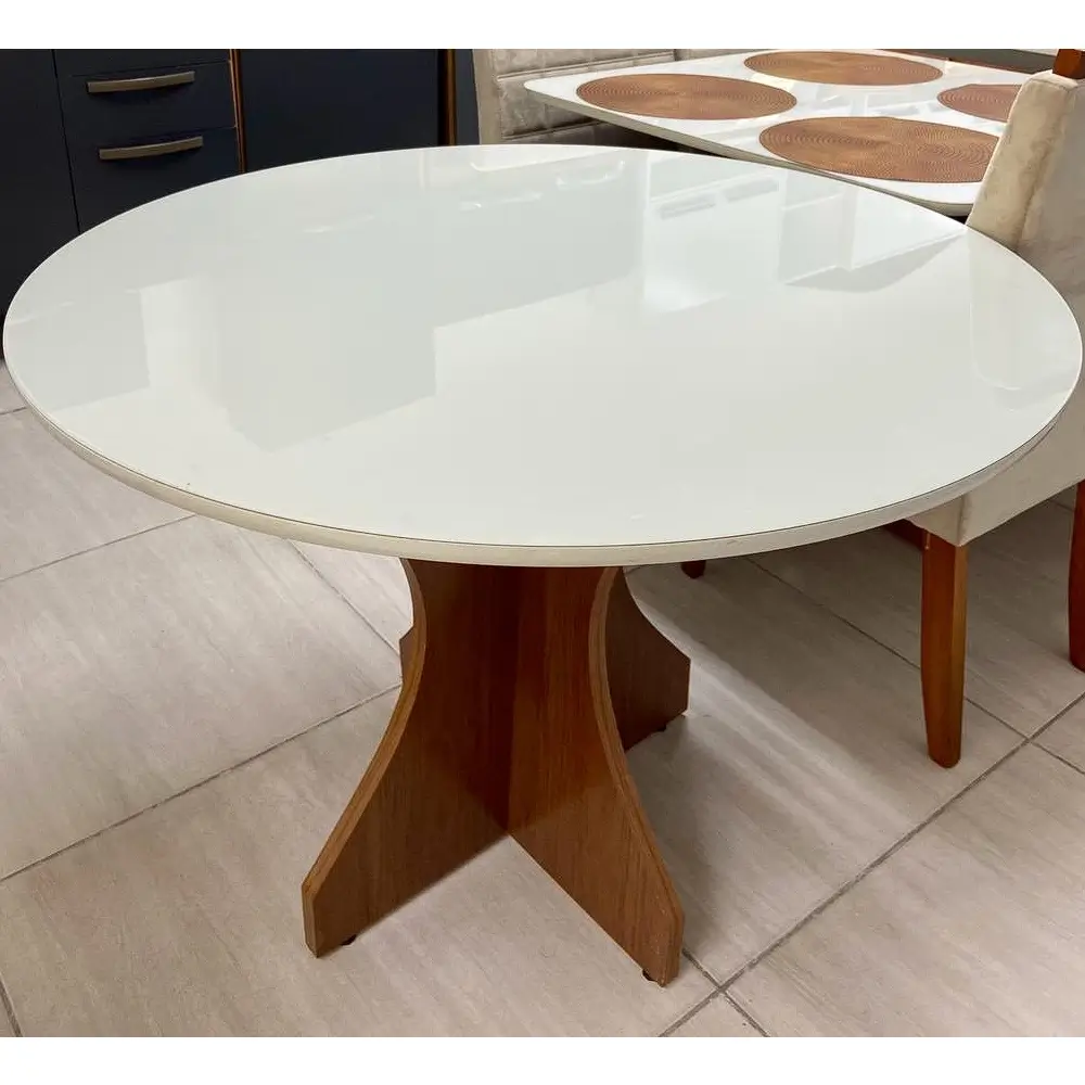 O tampo redondo, com acabamento usinado, possui um vidro laqueado de 3mm já colado, garantindo durabilidade e facilidade na limpeza. A estrutura é feita em MDF de alta qualidade, proporcionando resistência e estabilidade. Além disso, os pés com regulagem são um diferencial que permite ajustar a mesa em superfícies irregulares, assegurando que ela esteja sempre nivelada.