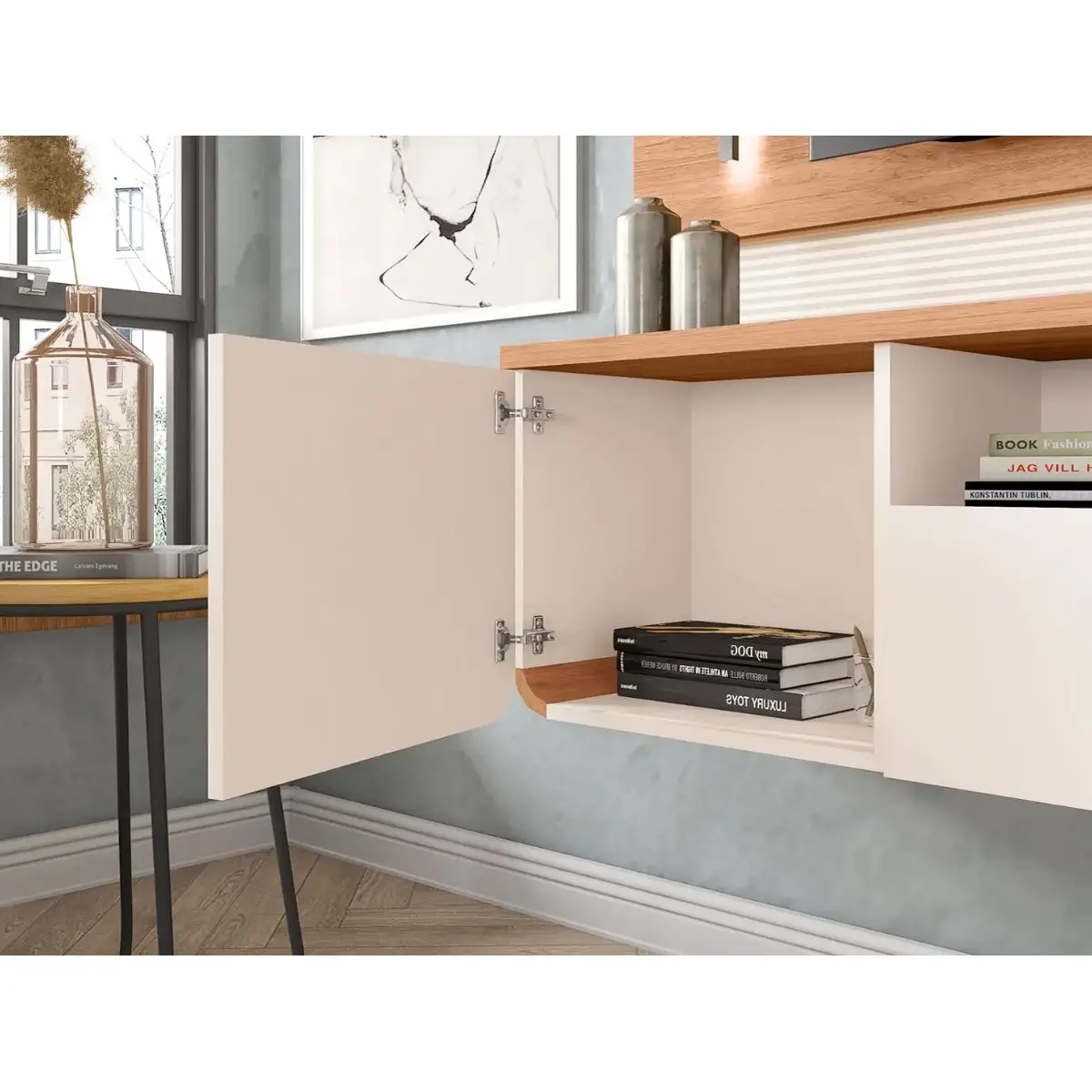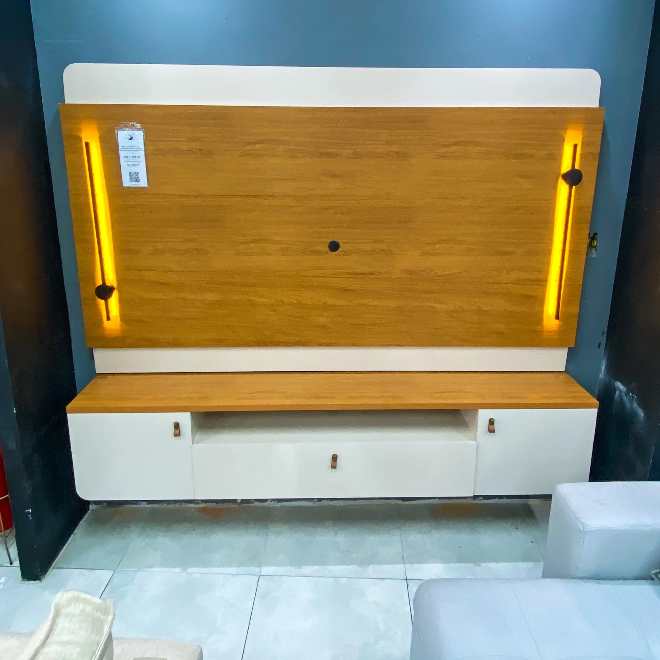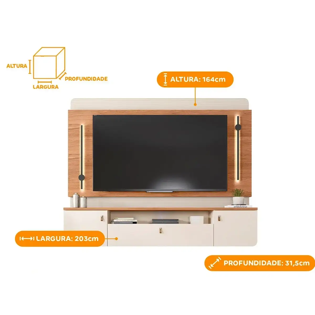 Seu design é enriquecido com detalhes que fazem a diferença, como o acabamento ripado, que adiciona uma textura suave e contemporânea, e os charmosos puxadores em couro, conferindo um toque de requinte ao conjunto. O painel também conta com uma iluminação em LED integrada, criando um efeito luminoso aconchegante que valoriza a beleza do móvel e do ambiente.