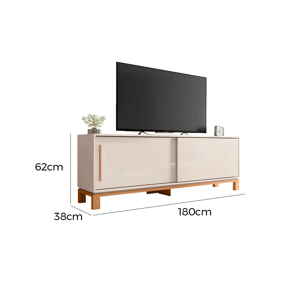 O móvel conta com duas portas que escondem compartimentos internos espaçosos, ideais para armazenar eletrônicos, cabos, controles e objetos diversos, mantendo o ambiente sempre organizado. Além disso, os nichos abertos facilitam a disposição de aparelhos como consoles e receptores, enquanto a superfície ampla permite dispor itens decorativos com criatividade.